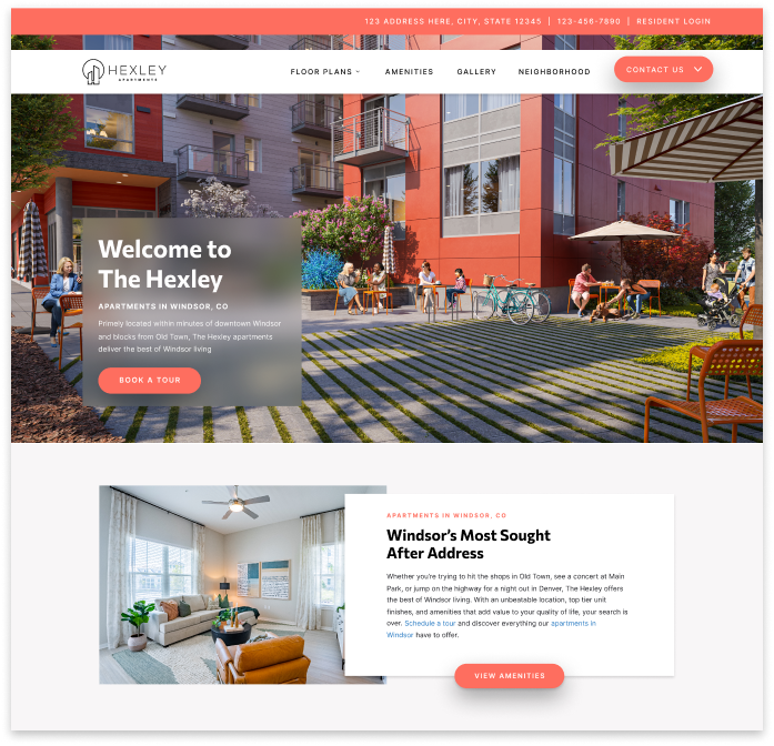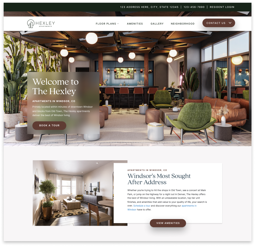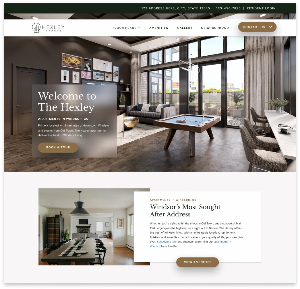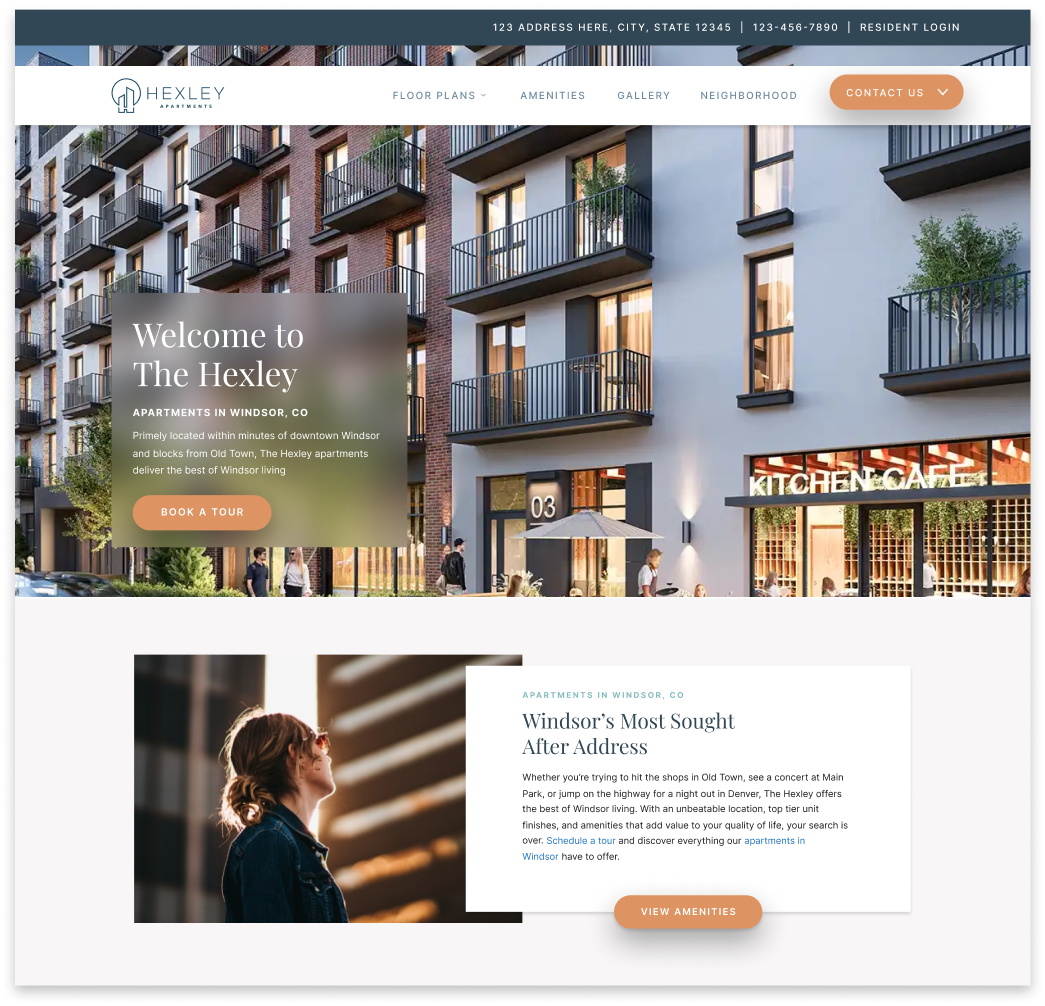 A modern and timeless apartment website design that is a top-seller. A unique website frame gives Hexley an editorial vibe.